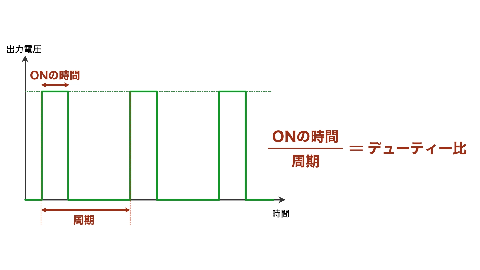 PWMでは、一定の周期の中で「ONの時間」の割合を変えて制御します。この比率のことをデューティ比と呼びます。(半分の時間をONにした場合、デューティー比は0.5または50%になります)