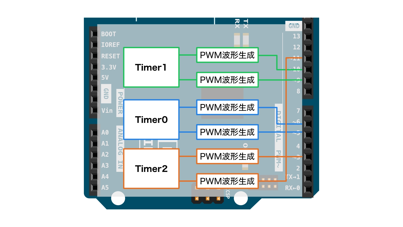 ArduinoのPWM出力は、マイコン内部のハードウェアタイマーを利用しています。一つのボード(マイコン)には複数のハードウェアタイマーが搭載されていて、各PWMピンはいずれかのタイマーに紐付けられています。