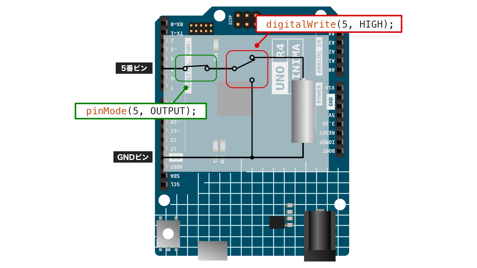 例えばdigitalWrite(5, HIGH);という処理を行うと、イラストの赤枠のように電源のプラス側に接続されます。